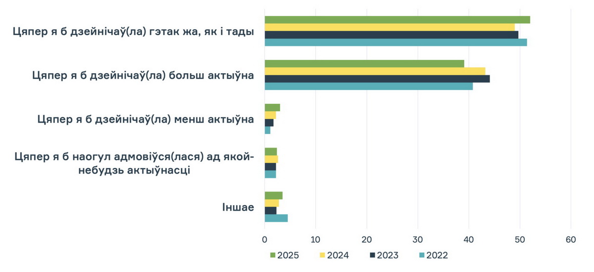Около половины респондентов по-прежнему считают, что протест не потерпел поражения. Среди главных препятствий победе в опросе лидируют поддержка режима Лукашенко со стороны России (79%), сильный силовой аппарат (58%), недостаточная организация и слабое лидерство. Ширится мнение и о том, что у протестов не было лидеров либо лидеры были слишком слабыми (24% в 2022 году и 36% в 2025 году).