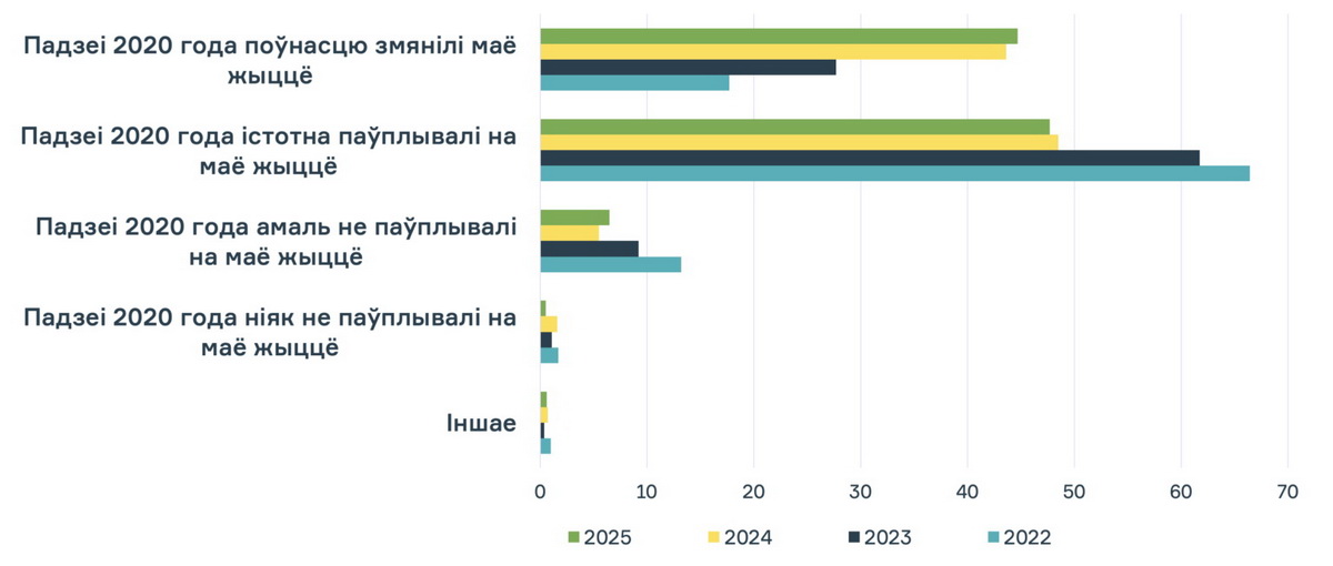 Согласно полученным данным, более 90% респондентов считают, что события 2020–2021 годов существенно или полностью изменили их жизнь. При этом пропорции между ответами «События 2020 года существенно повлияли на мою жизнь» и «Жизнь изменилась полностью» за последние четыре года почти сравнялись. Если раньше доминировал первый вариант — 66%, а второй имел 18%, то теперь их доли составляют 48% и 45% соответственно. То есть сегмент тех, кто считает, что после протестов их жизнь изменилась полностью, за четыре года вырос в 2,5 раза — с 18% до 45%.