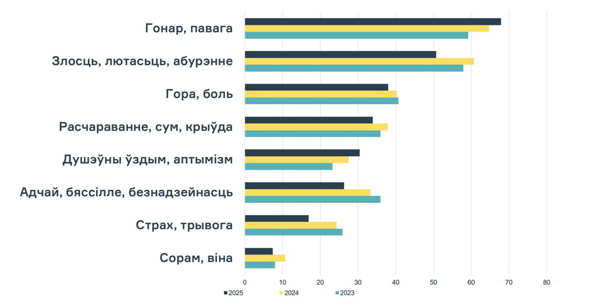 Эмоциональный фон событий за последние два года изменился в некторых аспектах: усилились чувства гордости и уважения (68%). На втором месте в сфере чувств стоят злость, ярость — их отметили 51% опрошенных (стало меньше на 7%). На третьем месте — горе и боль — 38%. Также по сравнению с 2023 годом на 7% выросла доля тех, кто выбрал «Душевный подъем, оптимизм». И на 10% снизилась доля тех, кто отметил «отчаяние, бессилие, безнадежность».