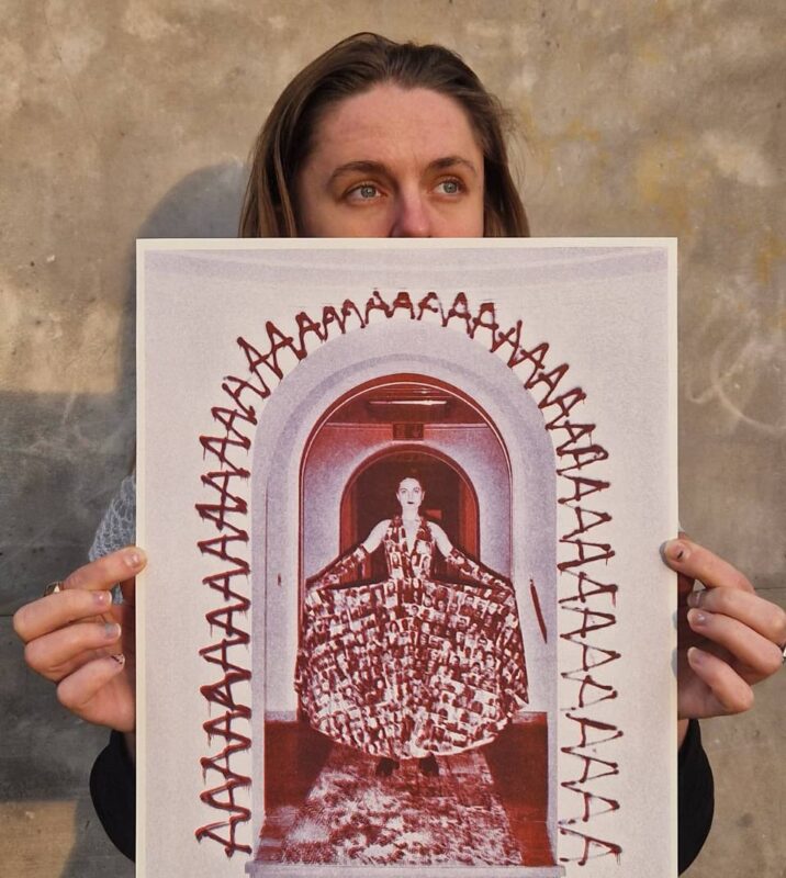 Яна Шостак на фотаздымку паўстае паміж святлом і цемрай, нібы постаць на мяжы. Сукенка нясе на сабе твары беларускіх палітычных зняволеных. Гэта не ўпрыгожванне, а прысутнасць. Партрэты выступаюць як галасы, якія немагчыма заглушыць, напамін аб гвалце сістэмы і аб тых, хто пазбаўлены волі і права на справядлівасць.