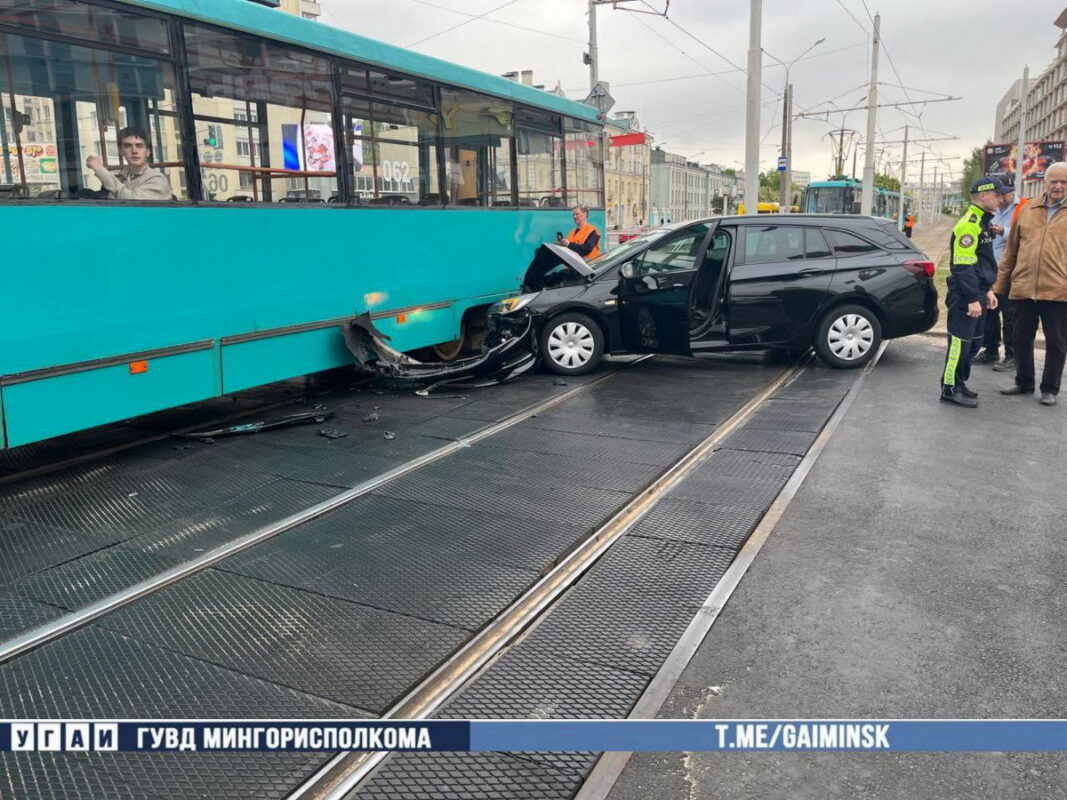 ДТП произошло сегодня около 18:45 на улице Максима Богдановича. 78-летний водитель Opel на пересечении с проспектом Машерова продолжил движение на красный сигнал дополнительной секции светофора и столкнулся с трамваем, который ехал через перекресток на зеленый.