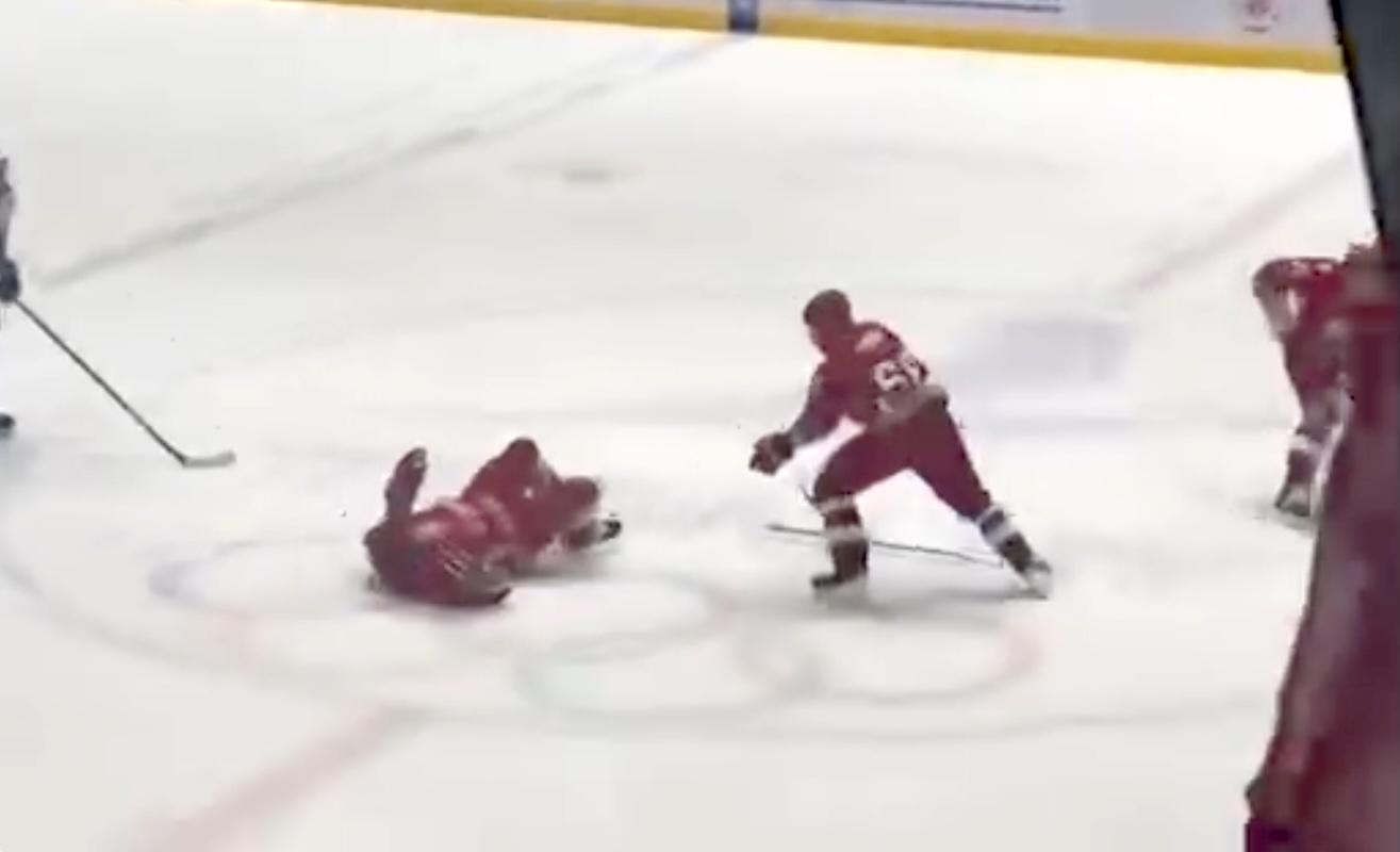 Лукашенко свалился с ног, выронил клюшку и упал на спину. Самостоятельно он подняться не смог.