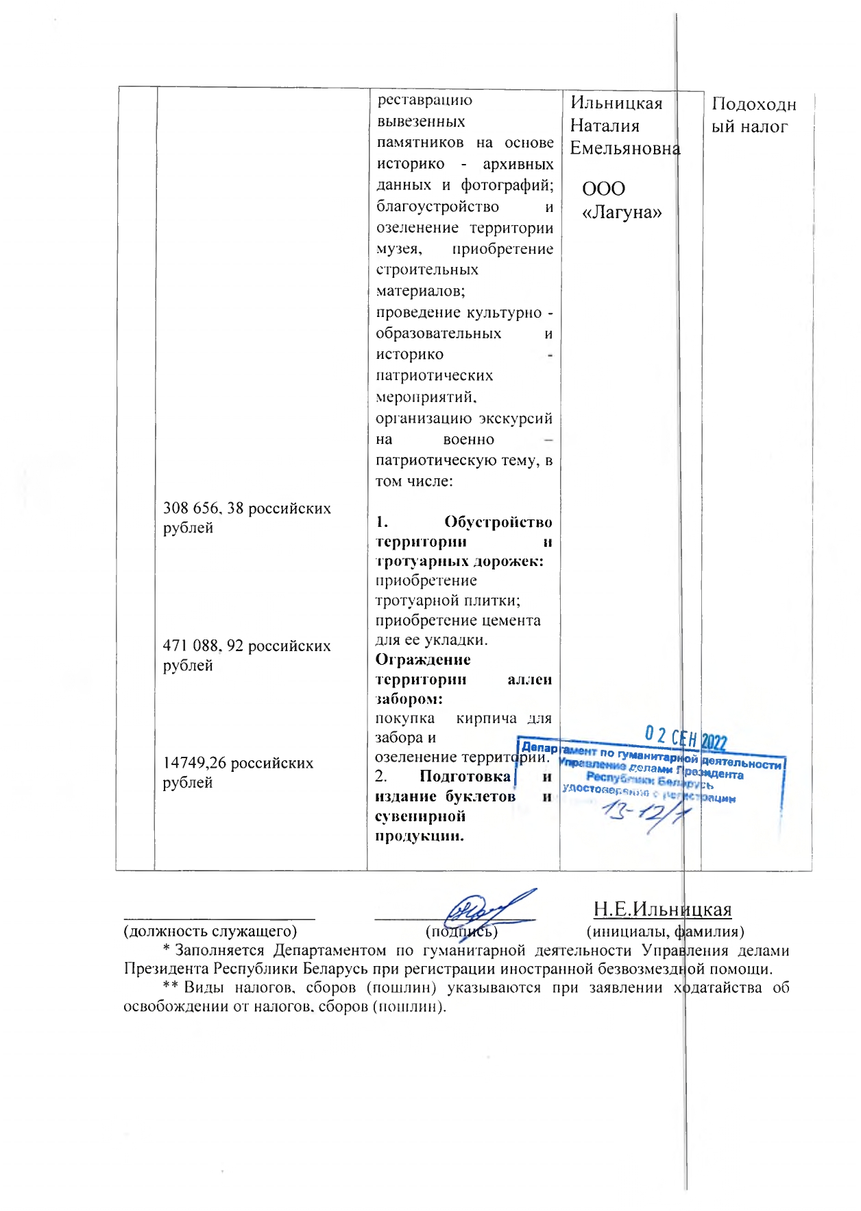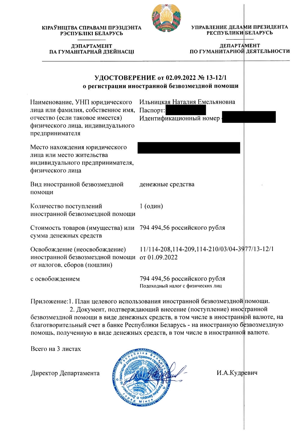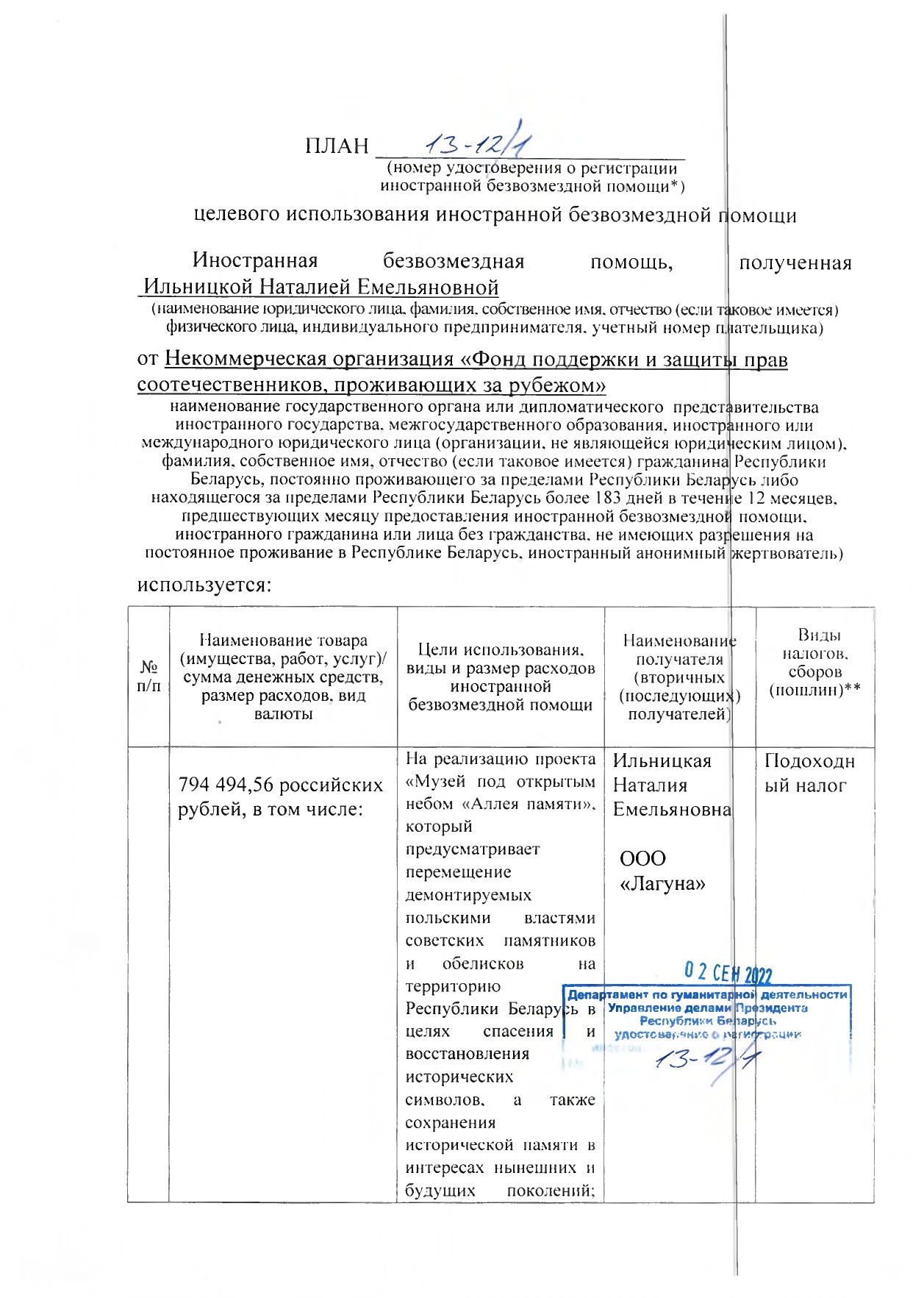 Владелица музея под открытым небом «Аллея памяти» Наталия Ильницкая получила в июне 2022 года от «Правфонда» почти 13 тысяч долларов.