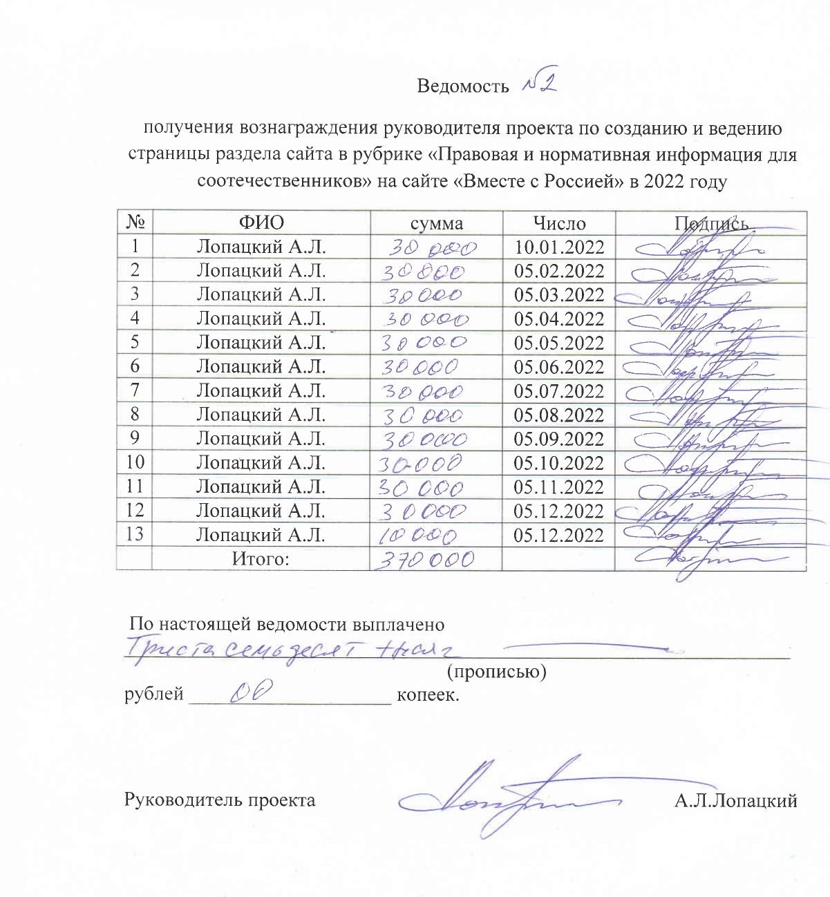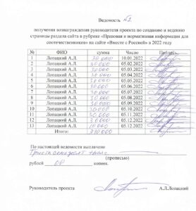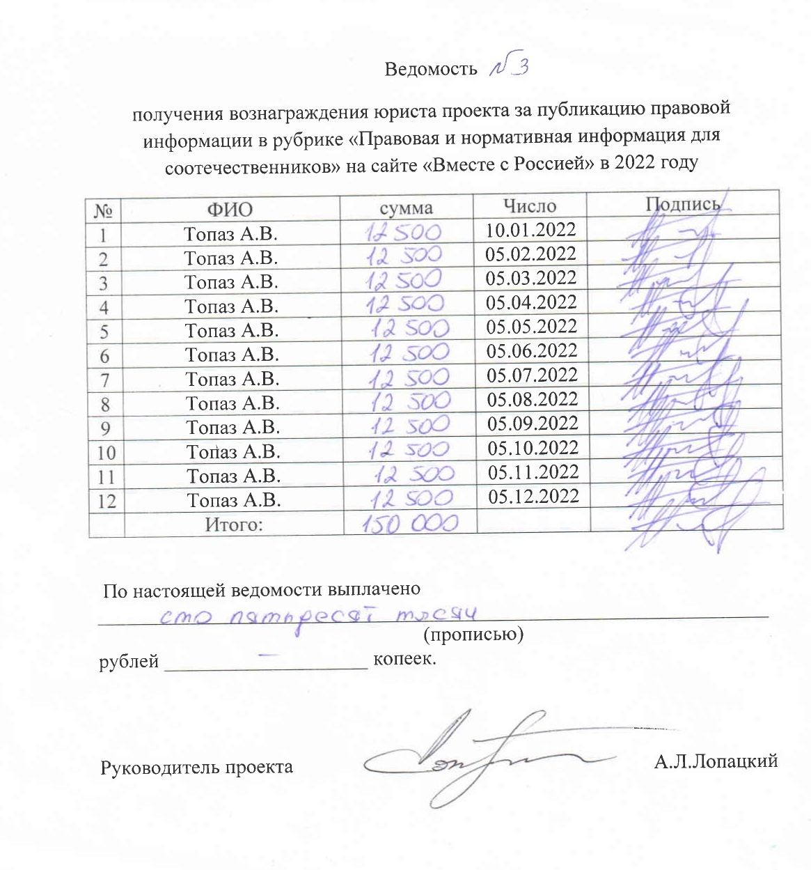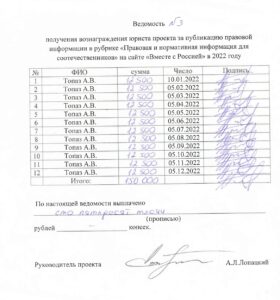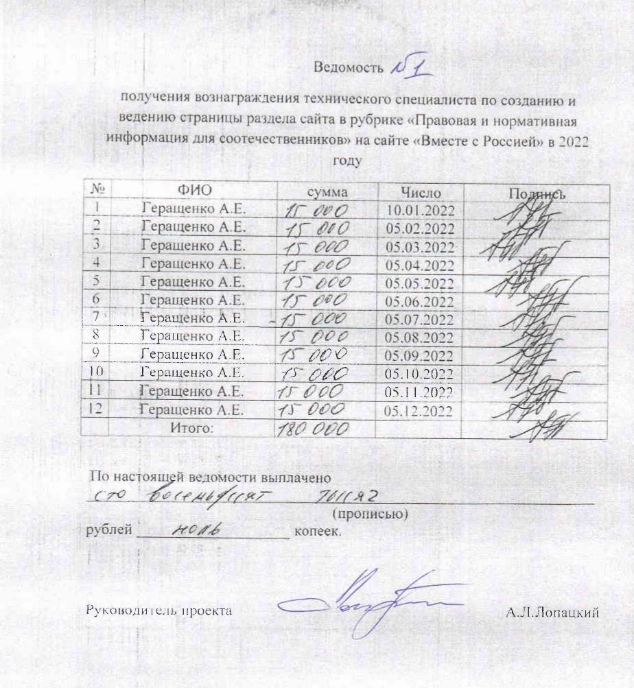 Его шеф и коллега Геращенко получал гонорары как технический специалист сайта «Вместе с Россией» из гранта «Правфонда». Опубликована ведомость, по которой деньги также получал активист Андрей Топаз.