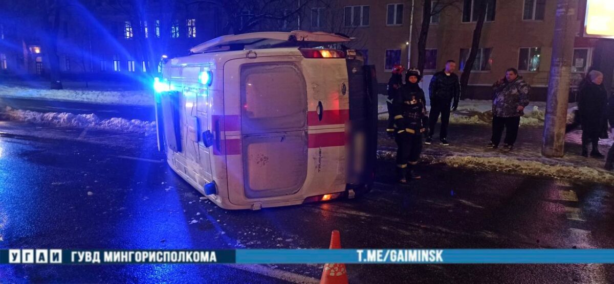 Как рассказали в УГАИ ГУВД Мингорисполкома, автомобиль скорой помощи двигался на запрещающий сигнал светофора с включенными проблесковыми маячками синего цвета и звуковой сигнализацией. Он столкнулся с легковушкой Mazda. На фотографиях, опубликованных ГАИ видно, что скорая опрокинулась на бок после удара.
