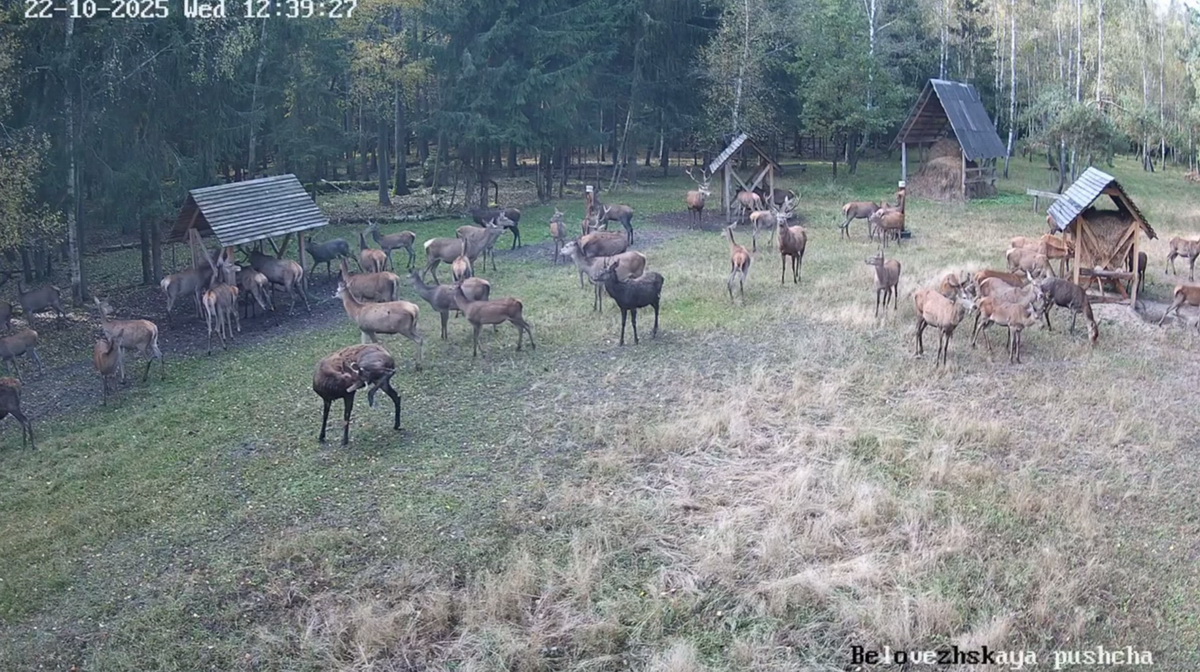 В объектив онлайн-камеры в Беловежской пуще попала большая группа оленей, собравшихся у кормушек. Видео, снятое днем 22 октября, опубликовал телеграм-канал заповедника.