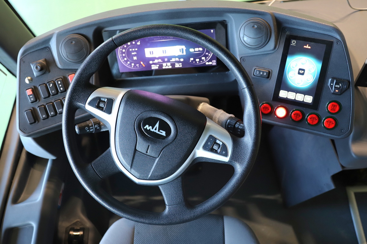 Каркас электробуса, передняя ось, алюминиевые профили, применяемый в обшивке пластик и облицовочные материалы, детали интерьера и экстерьера, сиденья, шины, комплектующие электрооборудования, остекление, рабочее место водителя нового поколения, мультиплексная система, рулевой механизм, тормозные системы и др — беларусского производства.