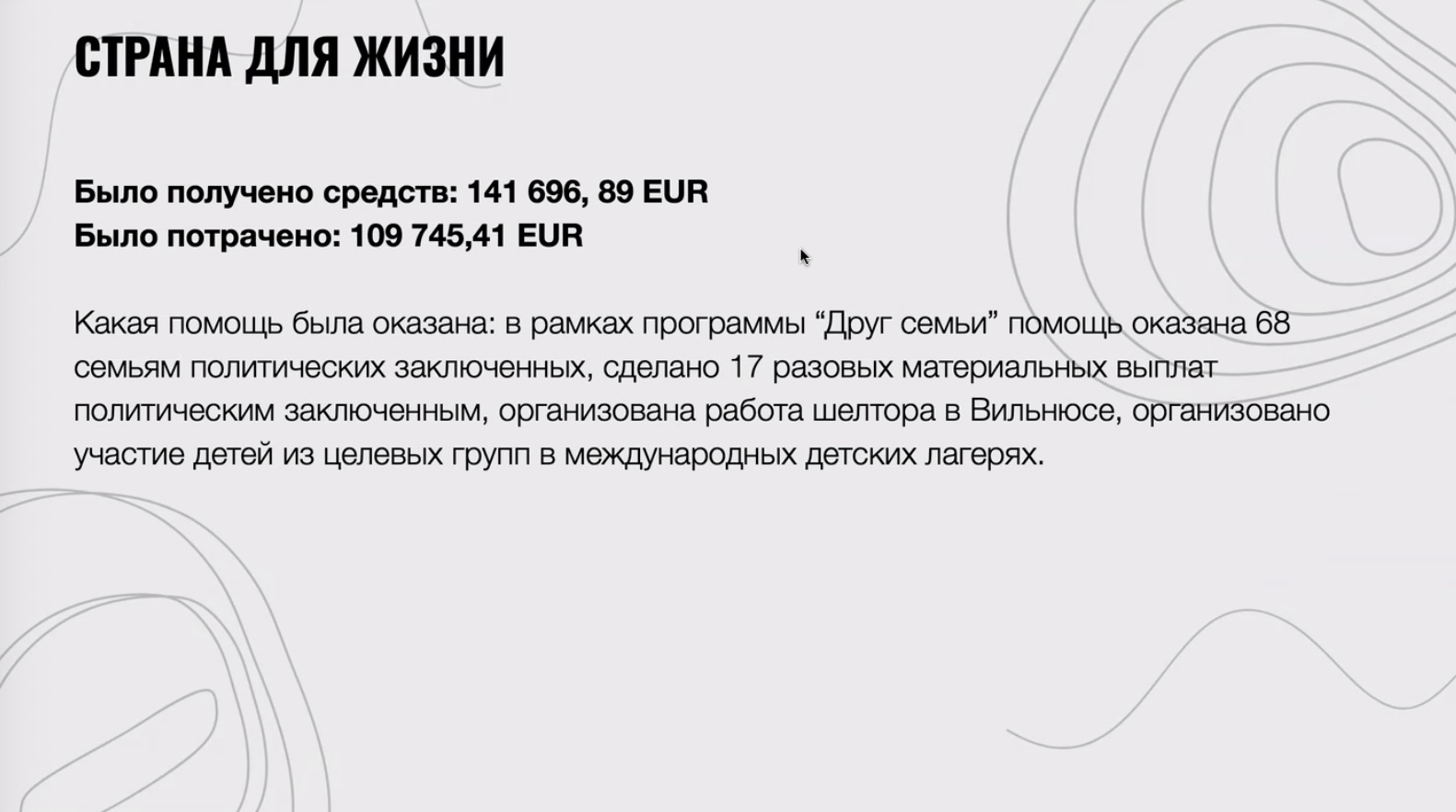 - Страна для жизни: получено — 141 696,89 евро, потрачено — 109 745,41 евро