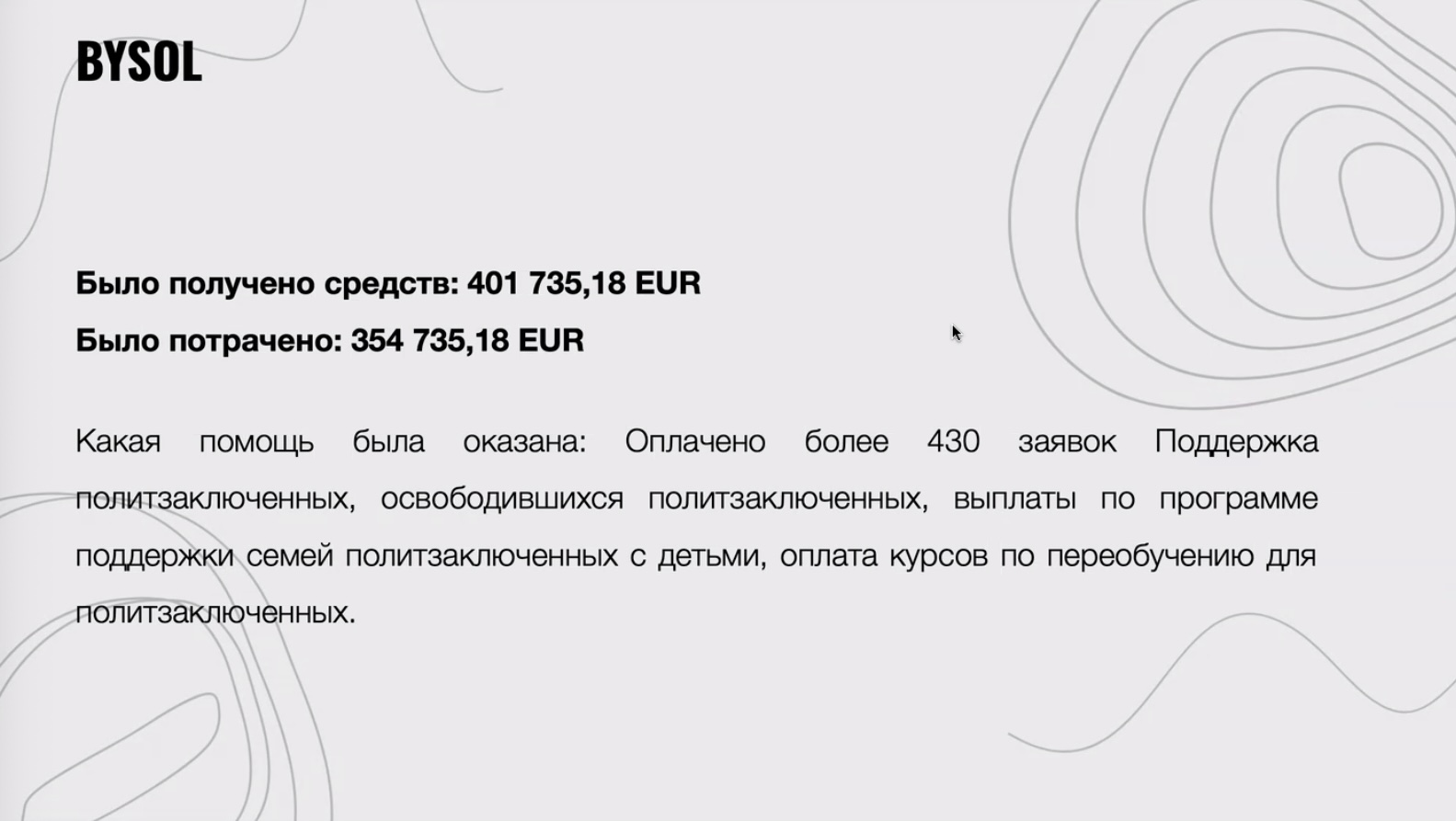 - BYSOL: получено — 401 735,18 евро, потрачено — 354 735,18 евро