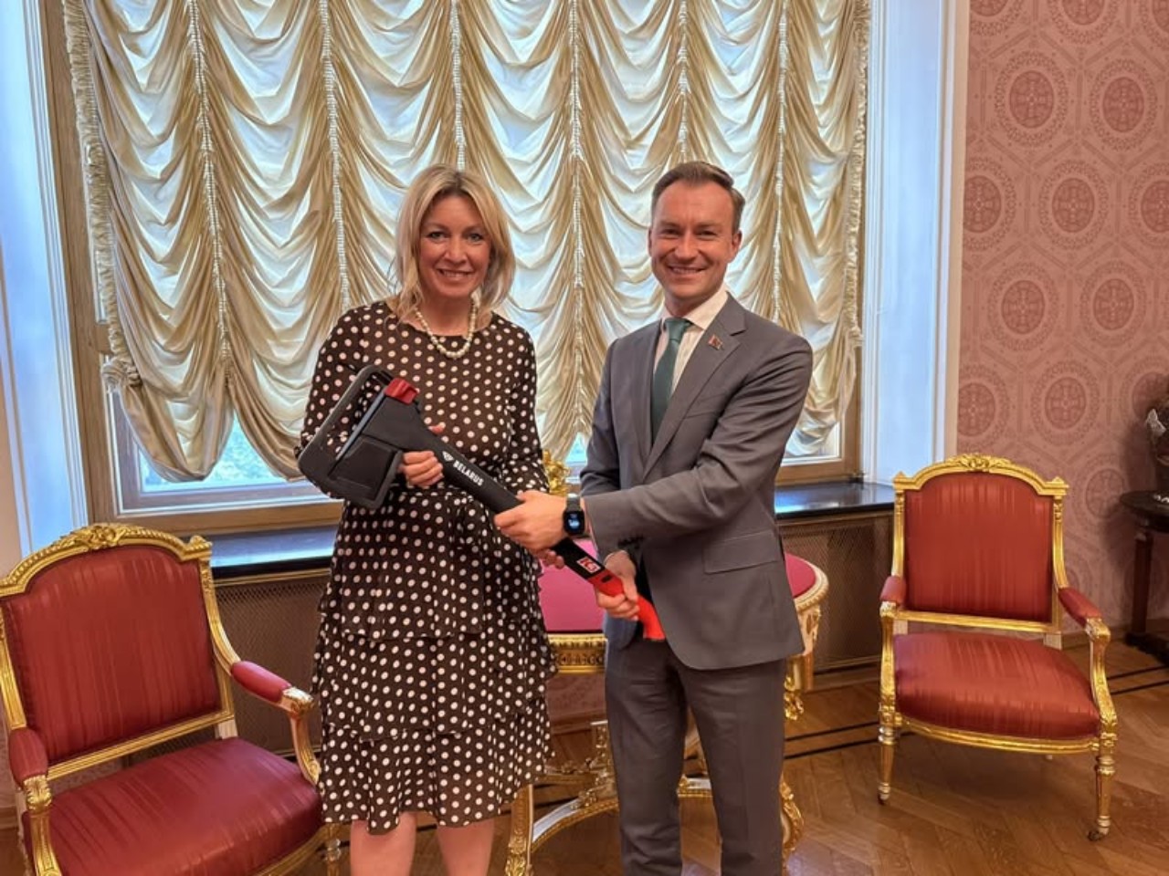 Беларусский дипломат вручил Захаровой странный подарок – топор производства МТЗ.