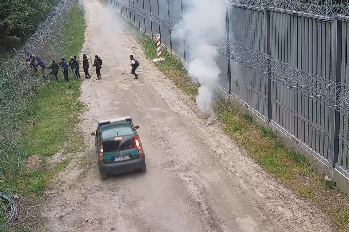 На этот раз в ход пошли также дымовые шашки. Пограничники опубликовали фотографию, на которой видна группа мигрантов, автомобиль погранслужбы и дымящаяся шашка.