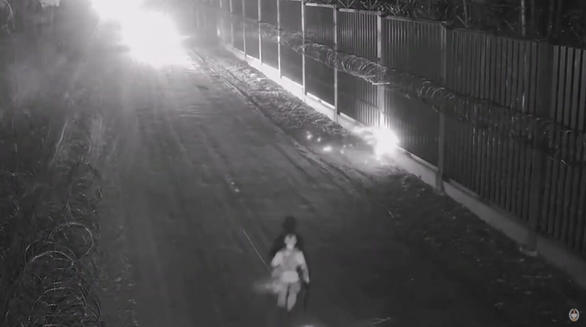 К месту попытки прорыва прибывает польский патруль, пограничник с помощью газового баллончика отгоняет пытающихся распилить забор. Судя по всему, в него летят какие-то предметы, он прикрывается рукой. Позднее прибывает подкрепление. Польские служащие продолжают отгонять мигрантов с помощью газа, но уже прикрывась щитом от летящих в них палок и других предметов.