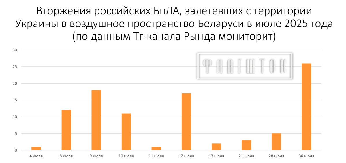 В ночь на 31 июля, во время очередной массированной атаки России на территорию Украины, было зафиксировано рекордное за последние месяцы число российских беспилотников, нарушивших воздушное пространство Беларуси. Об этом свидетельствует анализ данных украинских мониторинговых телеграм-каналов, проведенный изданием «Флагшток».