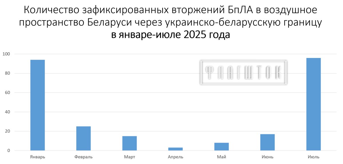 С учетом всех залетевших в июле в Беларусь российских БПЛА побит месячный рекорд января 2025 года — минимум 96 случаев нарушения воздушного пространства Беларуси через Гомельскую, а также Брестскую области.