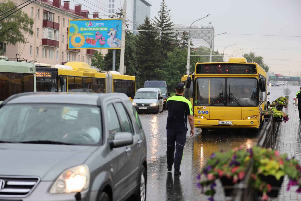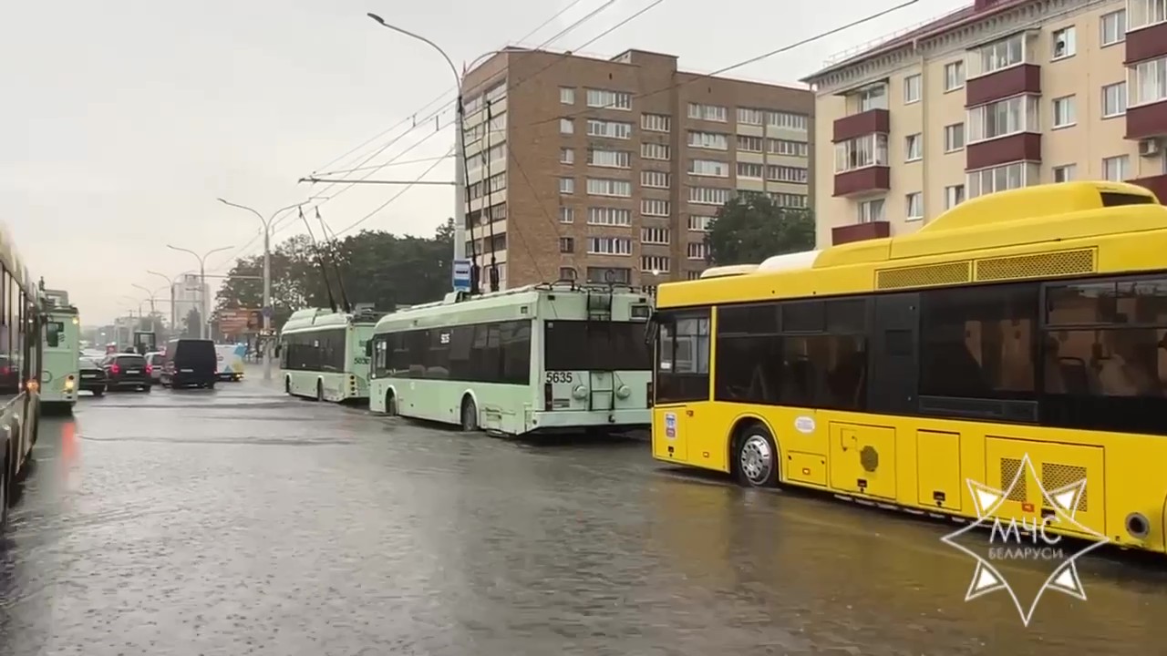 Так, «Минсктранс» сообщает об остановке движения автобусов, трамваев и троллейбусов из-за подтоплений на улице Асаналиева, на перекрестке Плеханова-Якубова, на улицах Кабушкина, Казинца, Кижеватова, Свердлова, Якуба Коласа, перекрестках Ботаническая-Козлова и др.