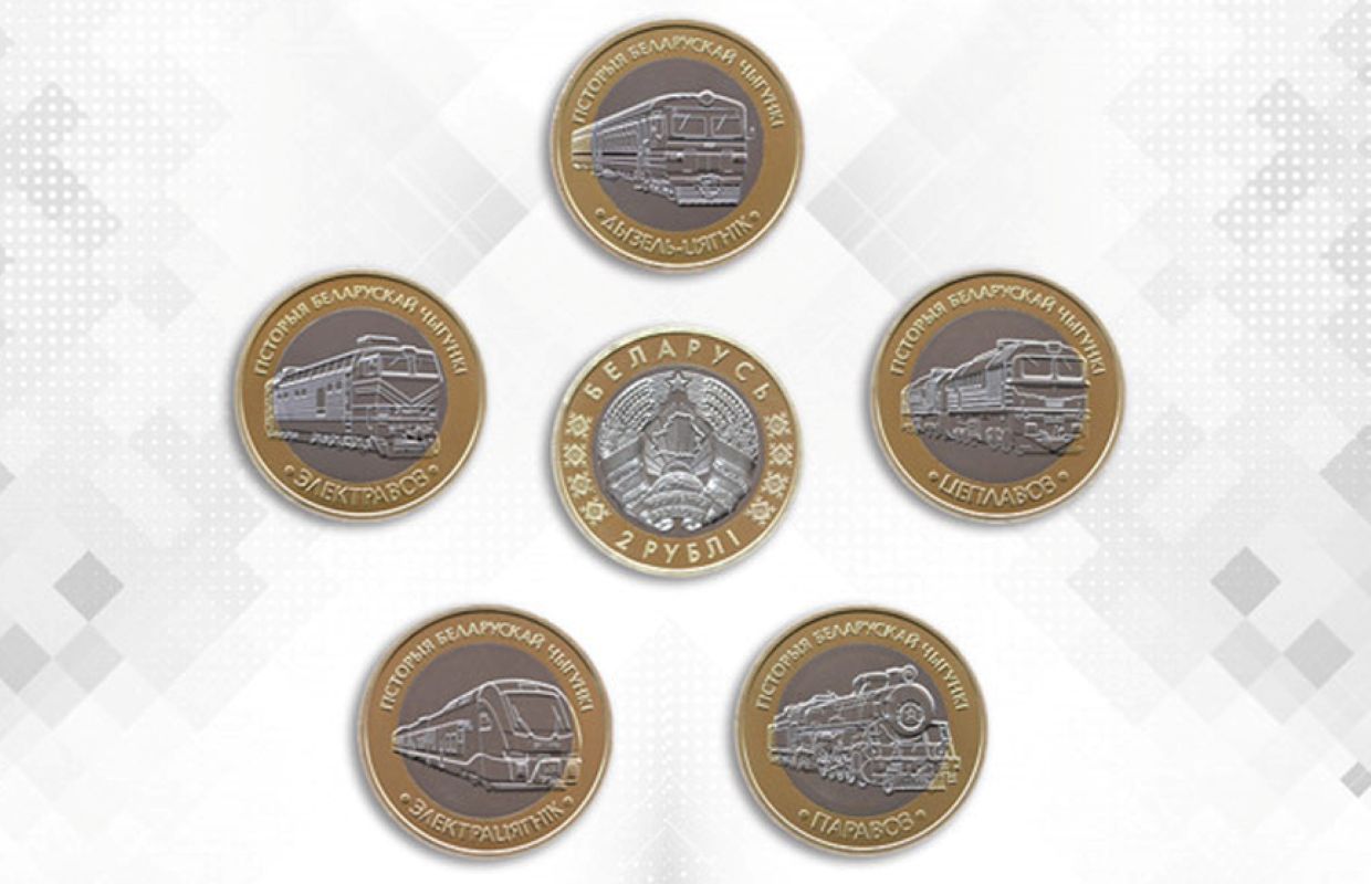 Усяго ў серыі «Гісторыя беларускай чыгункі. Цягнікі» пяць відаў манет наміналам у 2 рублі. На іх размясцілі выявы розных відаў чыгуначнага транспарту: паравоза, цеплавоза, электравоза, дызеля і электрацягніка.