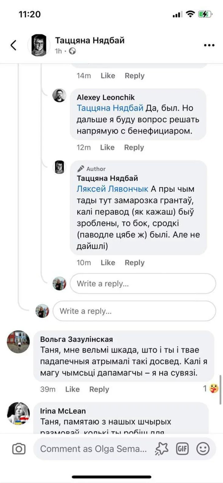 9 мая Вирус опубликовал пост с критикой сооснователя фонда BY_help Алексея Леончика и приложил скриншоты публичной дискуссии Леончика и главой беларусского ПЕН Татьяны Недбай в Facebook. Особенность Facebook в том, что когда любой пользователь читает дискуссию, в местах, где можно оставить комментарий, видна его аватарка. На опубликованных скриншотах видна аватарка человека, который их сделал, – это Ольга Семашко.