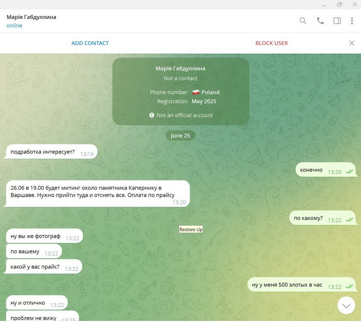 Обе «девушки» называли себя журналистками Port. За работу они предлагали оплату в размере 500 злотых и 100 евро. «Марiя» утверждала, что живет Вильнюсе и работает «внештатно». В своих сообщениях «девушка» допускала ошибки и несколько раз писала о себе в мужском роде.