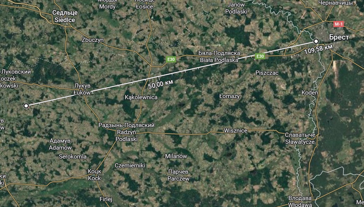 Расстояние от Осин до беларусской границы составляет около 110 км.
