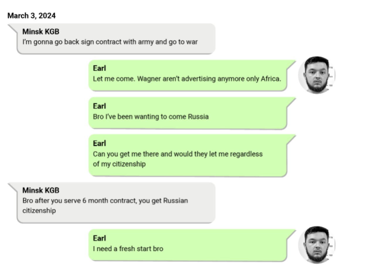 В переписке от 3 марта 2024 года контакт «Minsk KGB» сообщает, что собирается подписать контракт и отправиться на войну. Эрл просит взять его с собой, говорит, что хочет начать жизнь с нуля и приехать в Россию. Он спрашивает собеседника, может ли он помочь, учитывая, что у Эрла нет российского гражданства, а «Вагнер» не рекламирует свою деятельность нигде, кроме Африки.