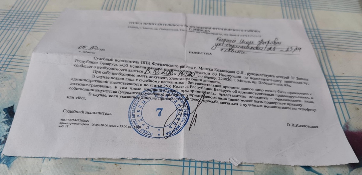 От бывшего политзаключенного журналиста Игоря Карнея требуют погасить задолженность в 63 рубля за полученные услуги в минском СИЗО №1 на улице Володарского. Уведомление, в котором ему угрожают «приводом» в случае неявки к судебному исполнителю, пришло на его беларусский адрес от отдела принудительного исполнения Фрунзенского района Минска. Историей журналист поделился на своей странице в Facebook.