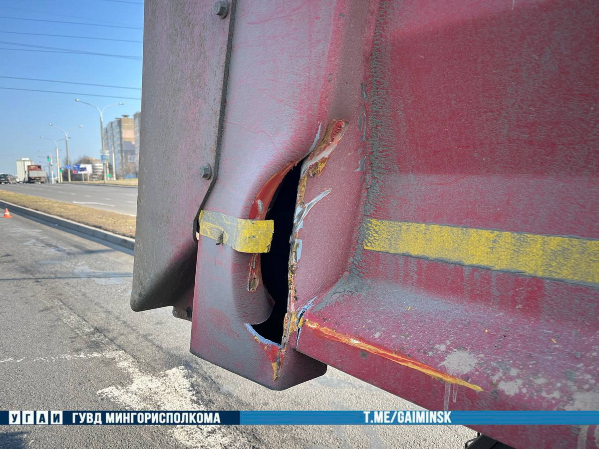 По данным УГАИ ГУВД Мингорисполкома, 23-летний водитель погрузчика-экскаватора Caterpillar при перестроении не убедился в безопасности маневра и столкнулся с грузовиком МАЗ. От удара погрузчик отбросило на автобус МАЗ. Четверо пассажиров автобуса доставлены в больницу.