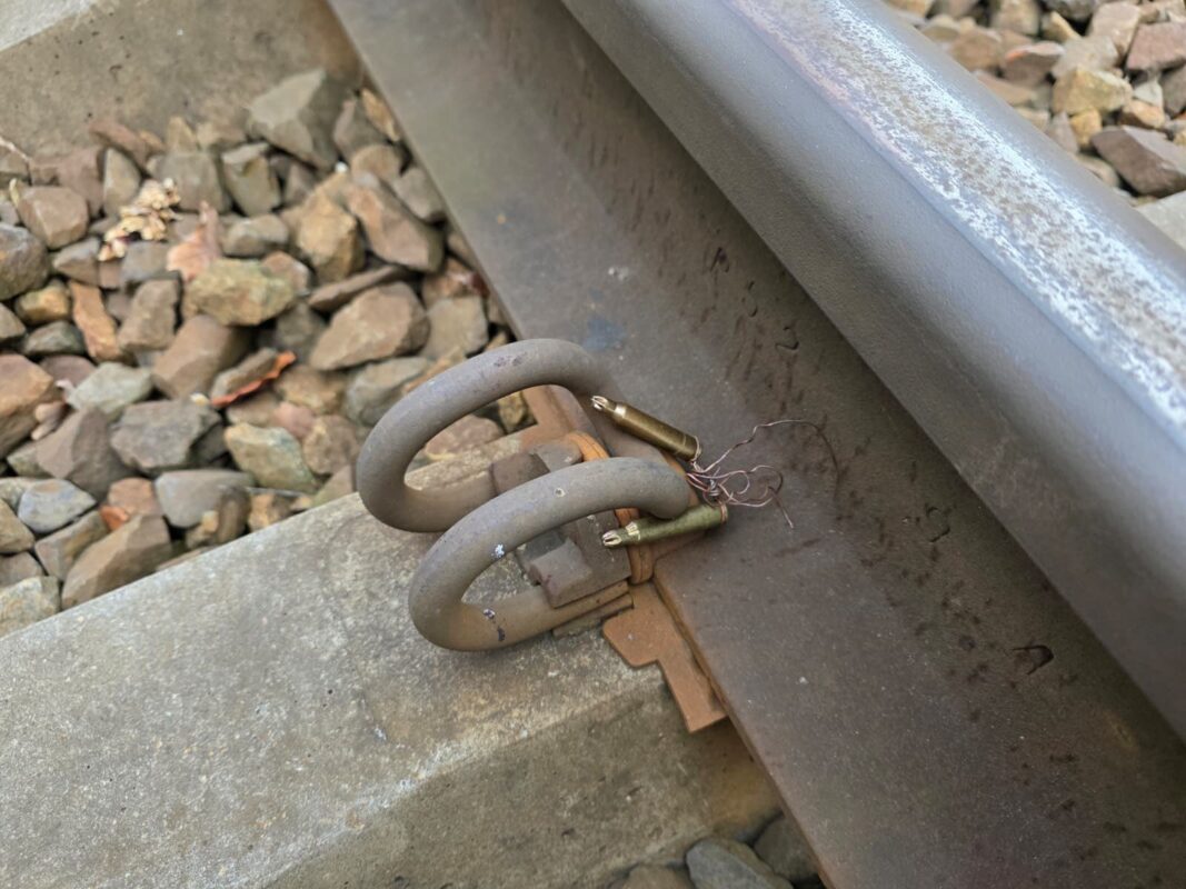 На снимке можно увидеть, что патроны соединены проволокой. На данный момент этот участок пути не используется.