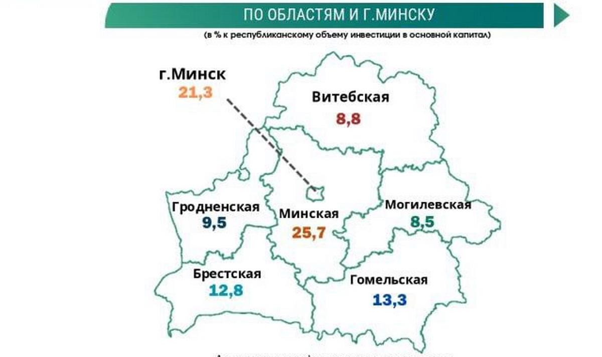 Наибольшая доля инвестиций была освоена в Минской области — 25,7% от общего объема по стране. На втором месте Минск с 21,3%. Таким образом, на долю столицы и столичного региона пришлось 47% от общего объема инвестиций в стране.