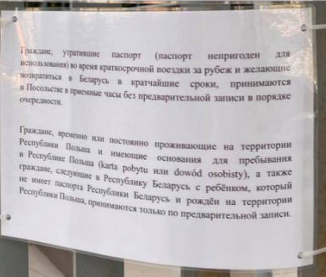 «Граждане, утратившие паспорт (паспорт непригоден для использования) во время краткосрочной поездки за рубеж и желающие возвратиться в Беларусь в кратчайшие сроки, принимаются в посольстве в приемные часы без предварительной записи, в порядке живой очереди», — говорится в нем.