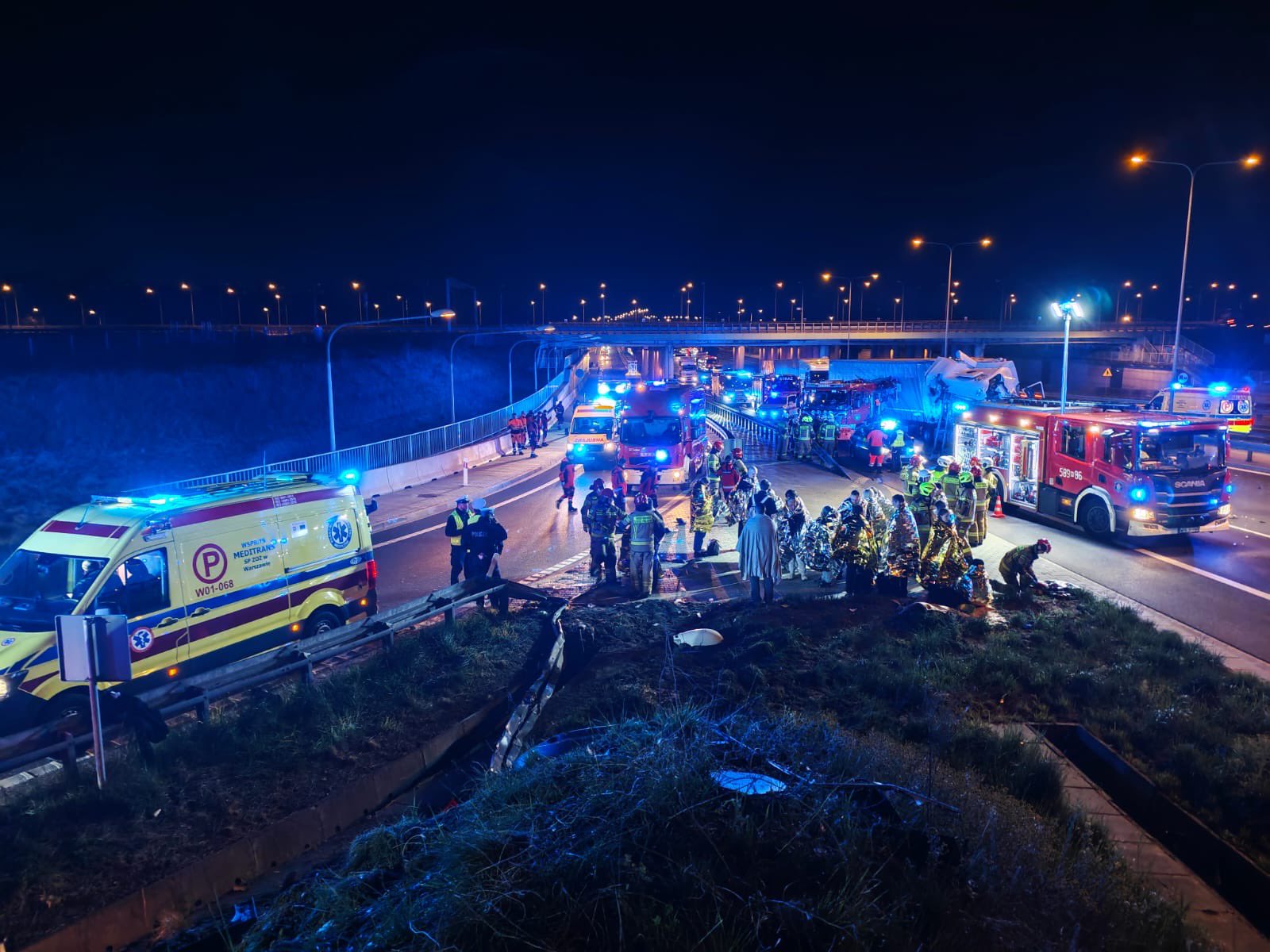 Автобус с 26 пассажирами сегодня ночью опрокинулся в кювет на развязке недалеко от варшавского аэропорта Шопена. Позднее в этом же месте фура врезалась в автомобиль пожарной службы, приехавший для оказания помощи.