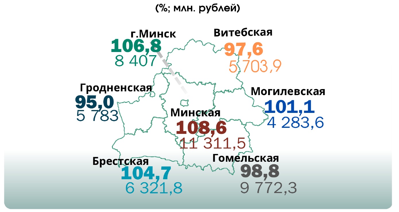 В Минской области промышленное производство выросло на 8,6%, в Минске — на 6,8%, а в Брестской области — на 4,7%, а в Могилевской — на 1,1%.