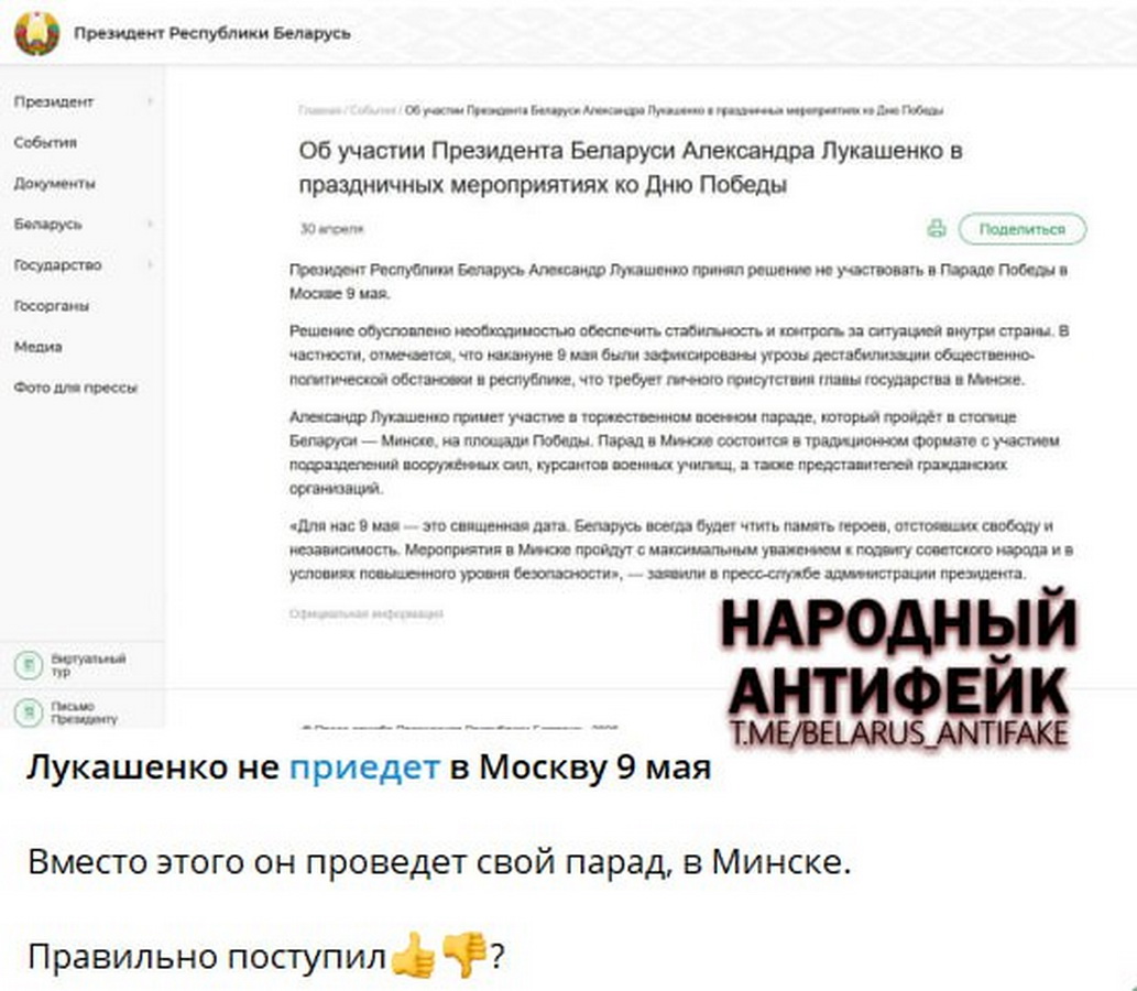 «В сообщении указано, что «Александр Лукашенко примет участие в торжественном военном параде, который пройдёт в столице Беларуси — Минске, на площади Победы». Хотя даже дети знают, что парады проходят у стелы «Минск – город герой», — такой аргумент приводят они в поддержку.