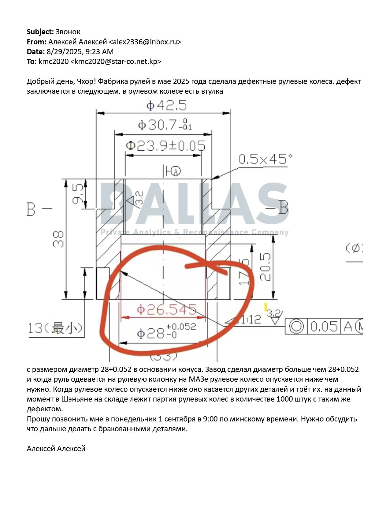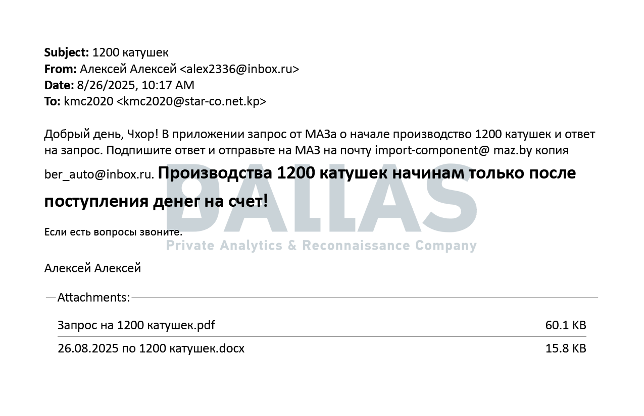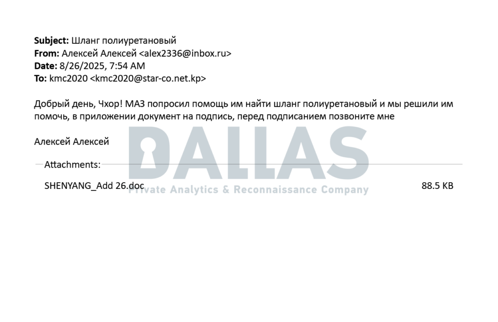 В почтовом архиве есть также переписка Адамовича с партнерами из КНДР. Из нее можно сделать вывод, что он содействовал закупке автомобильных комплектующих от имени МАЗа у торговой компании Chosun Kyonghun 1, базирующейся в Пхеньяне.