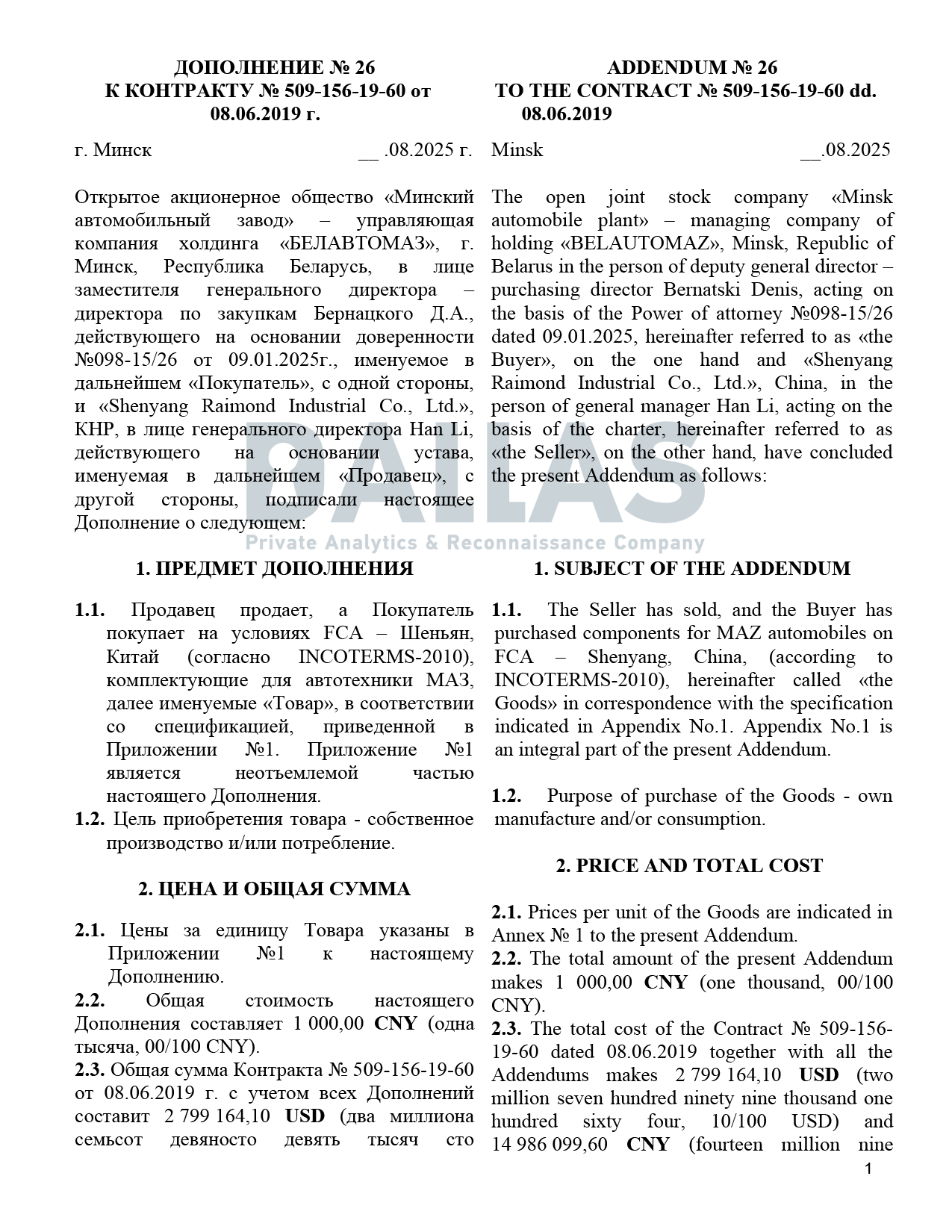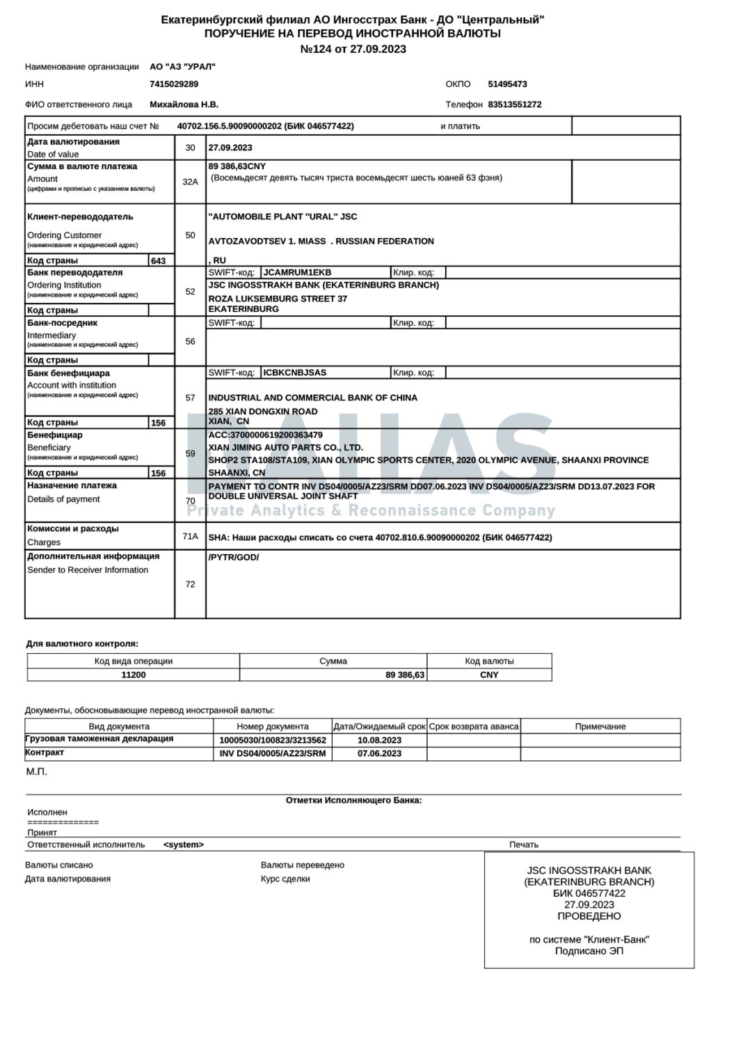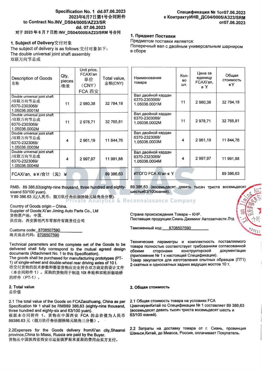 Речь идет о закупке приводных валов китайского поставщика «Сиань Синь Санмин» (Xi’an Xin Sanming Auto Parts Co., Ltd). Сделку структурировали так, чтобы избежать оплаты в долларах — платежи осуществляются в китайских юанях.