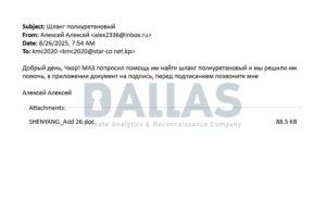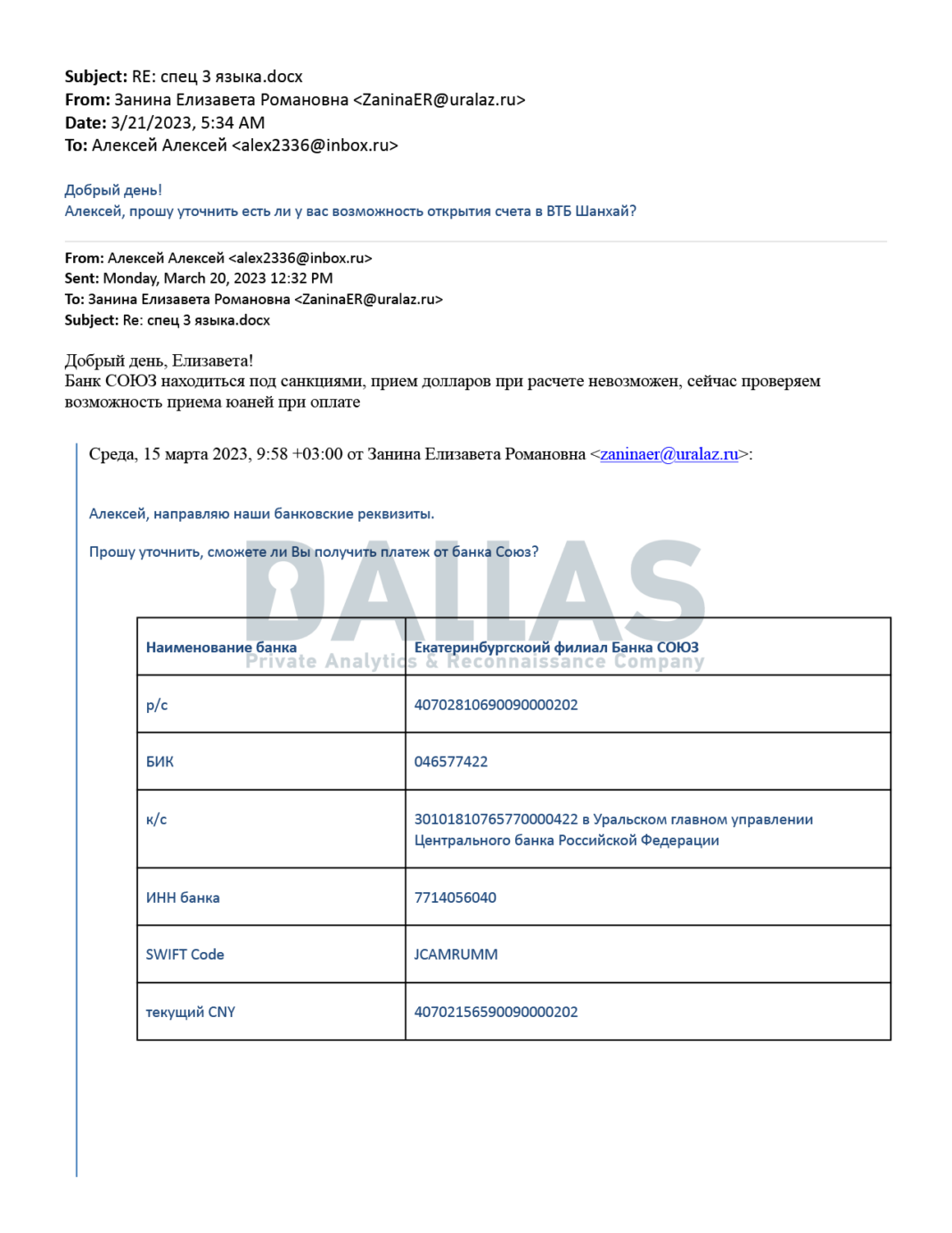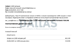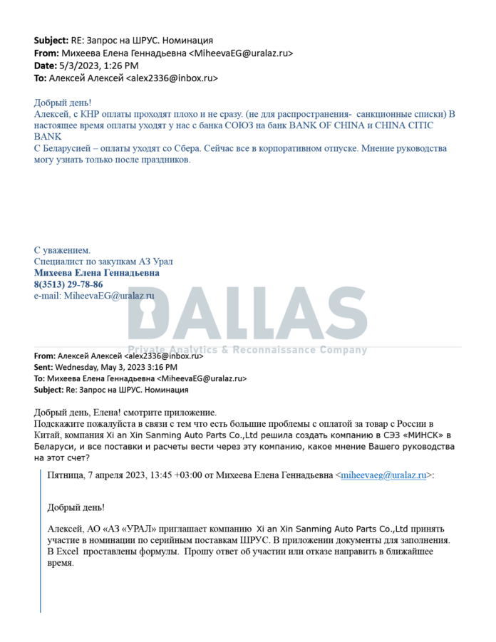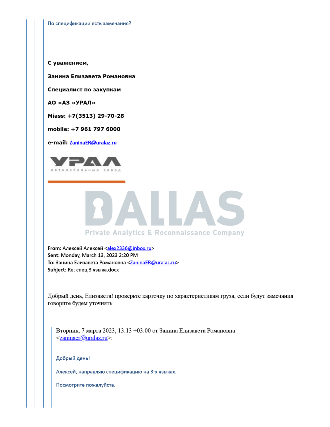 В расследовании опубликованы фрагменты переписки между Адамовичем и менеджерами по закупкам «УралАЗ» — Еленой Михеевой ([email protected]) и Елизаветой Заниной ([email protected]).