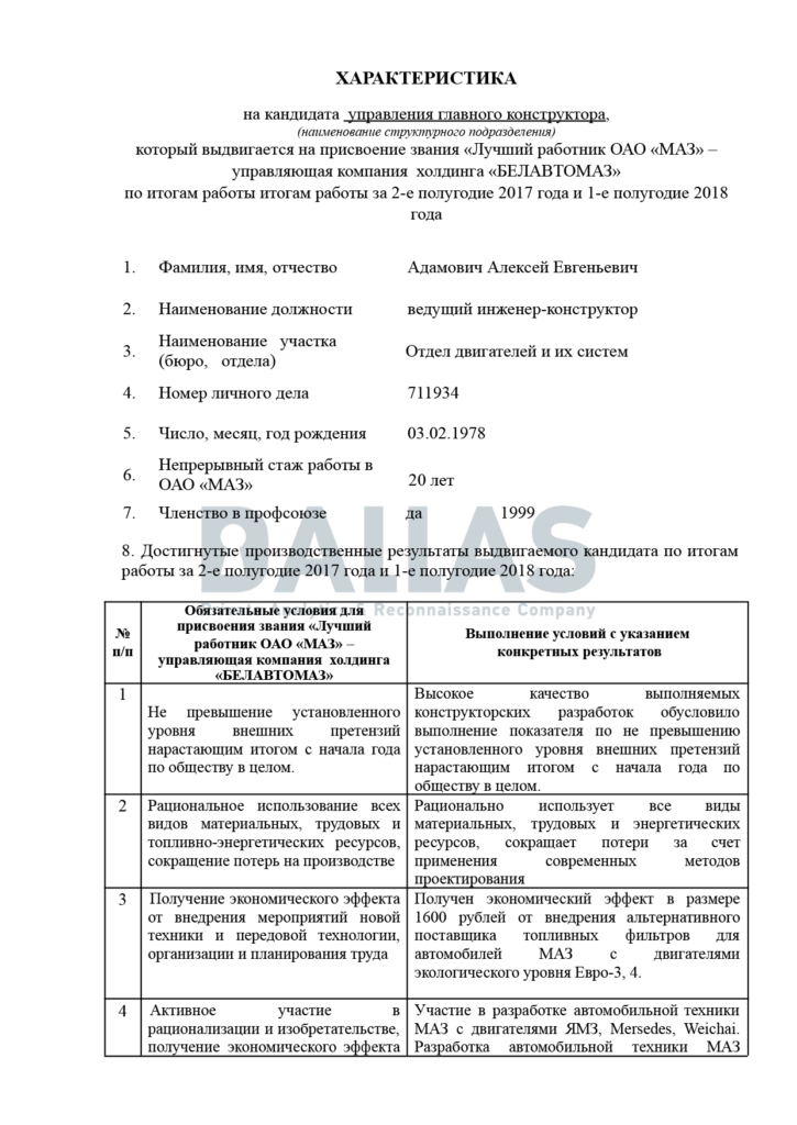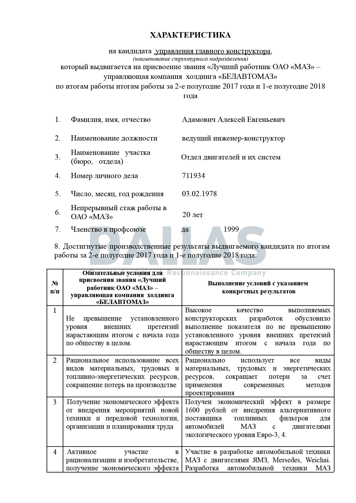 48-летний Алексей Евгеньевич Адамович начал работать на МАЗе в 1998 году. Судя по характеристике, к 2018 году занимал должность ведущего инженера-конструктора в отделе двигателей и систем.