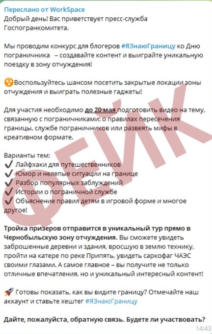 Дарэчы, Брэсцкая абласная дзяржаўная газета «Заря» не паверыла рассылцы Дзяржпагранкамітэта пра конкурс блогераў з галоўным прызам — паездкай у Чарнобыльскую зону адчужэння. Пра гэта рэдакцыя газеты адмыслова распавяла сваім чытачам у афіцыйным тэлеграм-канале і адзначыла, што гэта фэйк.