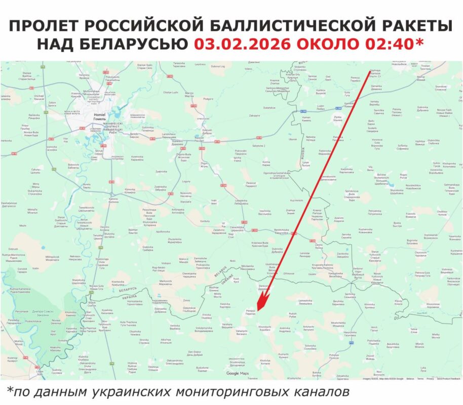 Российская баллистическая ракета пролетела над Гомельским районом около 02:40 3 февраля, сообщает «Флагшток» со ссылкой на украинские мониторинговые каналы.