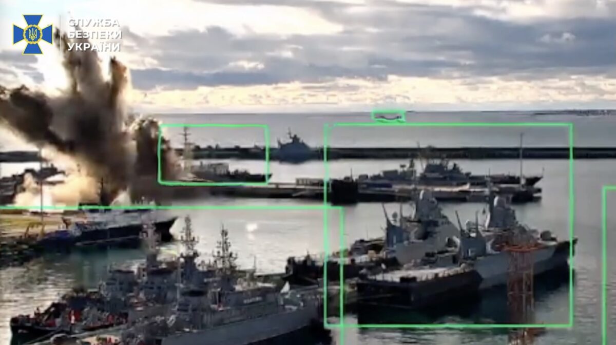 В подтверждение было опубликовано видео, где виден мощный взрыв в месте стоянки российских кораблей.