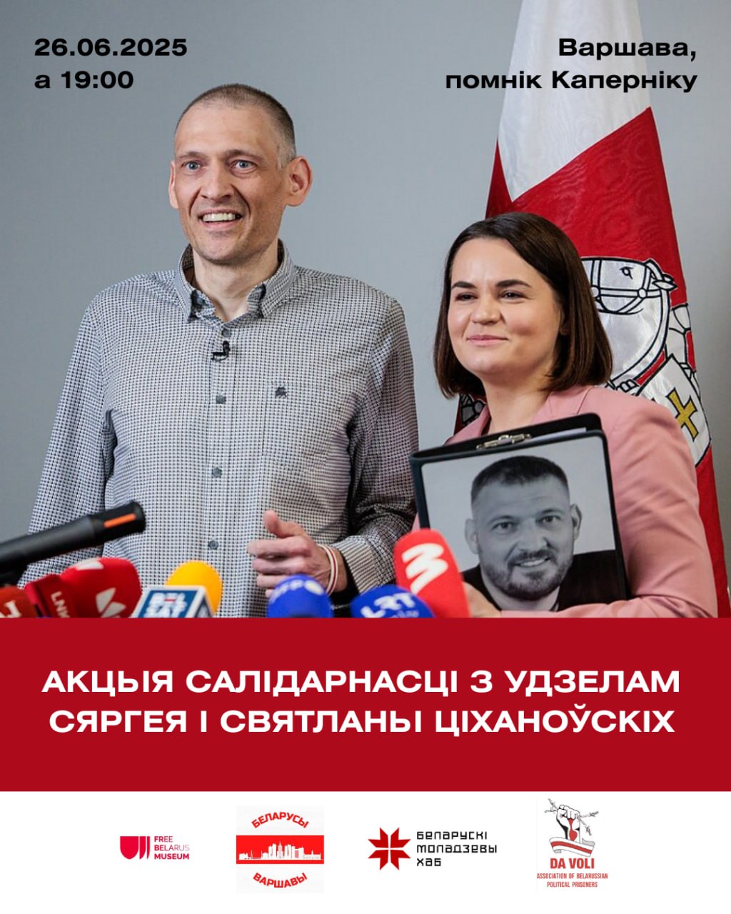 Сергей и Светлана Тихановские проведут встречу с беларусами Варшавы. Встреча в рамках акции солидарности с политзаключенными пройдет возле памятника Копернику 26 июня в 19:00.