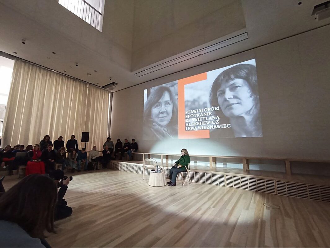 У Музеі сучаснага мастацтва ў Варшаве ідзе галоўная выстава Кіеўскай біенале, якая даследуе наступствы вайны і канфліктаў, а таксама задае пытанне, як грамадства дазваляе гвалту заставацца такім сістэматычным і беспакараным. У суправаджальнай праграме біенале прайшлі дзве сустрэчы з беларускімі аўтаркамі – Святланай Алексіевіч і Евай Вежнавец (Святланай Курс).