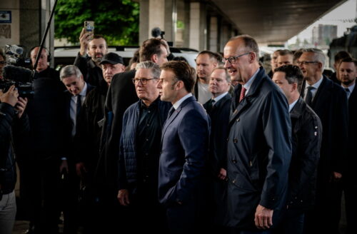 Президент Франции Эмманюэль Макрон, федеральный канцлер Германии Фридрих Мерц, премьер-министр Великобритании