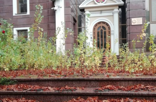 Территория возле посольства Беларуси в Украине поросла бурьяном, а ступеньки покрыты опавшими листьями.