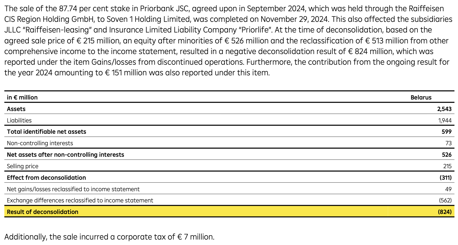 «На момент деконсолидации, исходя из согласованной цены продажи в размере 215 миллионов евро, собственного капитала за вычетом долей меньшинства в размере 526 миллионов евро и переклассификации 513 миллионов евро из прочего совокупного дохода в отчет о прибылях и убытках, был зафиксирован отрицательный результат от деконсолидации в размере 824 миллиона евро. Этот результат был отражен в статье «Прибыль/убыток от прекращенной деятельности. Дополнительно в результате продажи был начислен корпоративный налог в размере 7 миллионов евро», — говорилось в отчете.