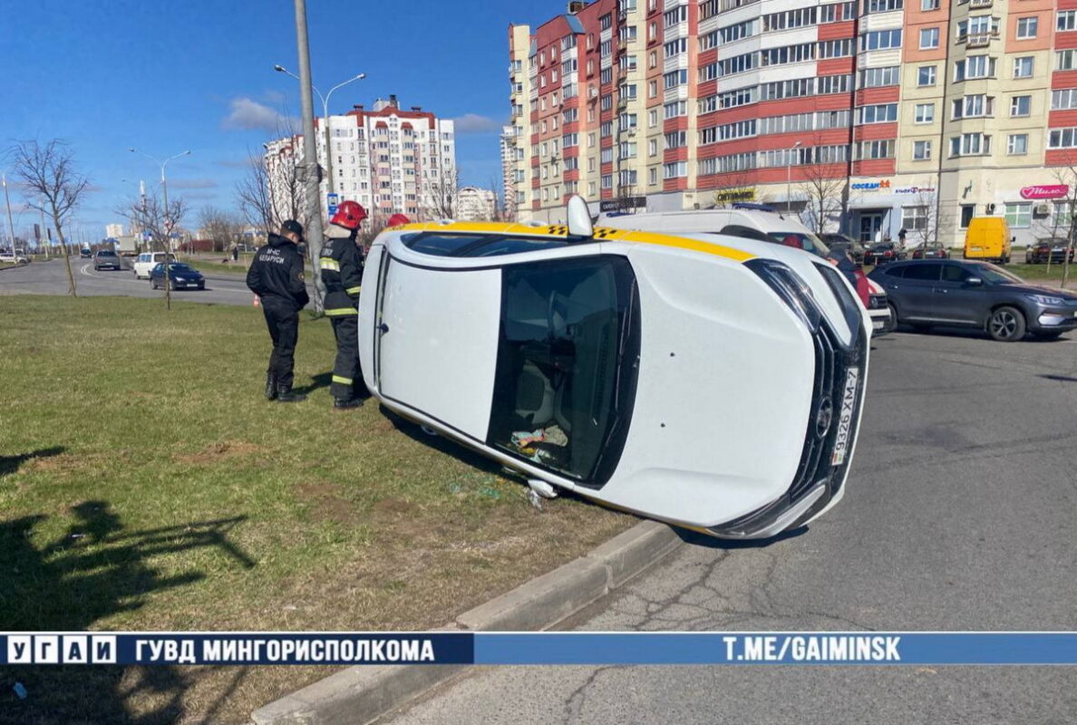 Такси влетело в бордюр и легло на бок в Минске, сообщает УГАИ ГУВД Мингорисполкома.
