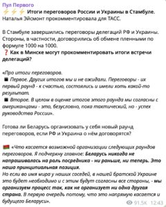В 13:54 беларусское госагентство БелТА выдает свой вариант заголовка для сообщения с комментарием Эйсмонт «Пресс-секретарь Президента Беларуси об итогах переговоров России и Украины в Стамбуле». При этом в тексте указано, что комментарий был дан российскому агентству, хотя пресс-служба Лукашенко, «Пул Первого» и БелТА — это по сути, разные названия для одной и той же структуры.