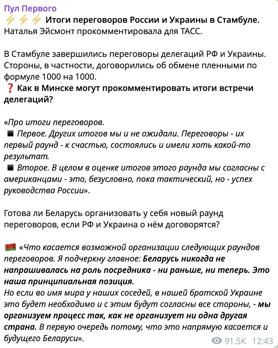 При этом в сообщении «Пула Первого» жирным выделены следующие слова «Беларусь никогда не напрашивалась на роль посредника — ни раньше, ни теперь. Это наша принципиальная позиция» и «мы организуем процесс так, как не организует ни одна другая страна». Фразы звучат предельно странно, потому что никто об этом Эйсмонт не спрашивал и никто не предлагал Беларусь в качестве переговорной площадки.
