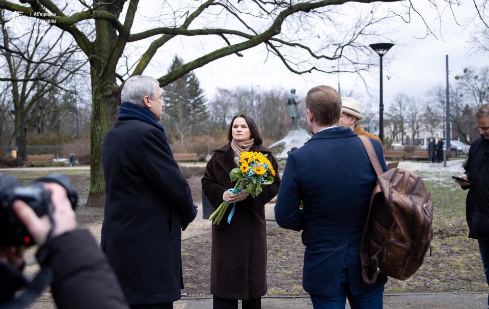 Глава Объединенного переходного кабинета Светлана Тихановская, ее заместитель Павел Латушко, представитель по национальному возрождению Павел Барковский, представительница по молодежной политике и студенчеству Маргарита Ворихова, руководитель аппарата ОПК Валерий Мацкевич возложили цветы к памятнику Тарасу Шевченко в Варшаве в годовщину начала полномасштабной агрессии России против Украины.