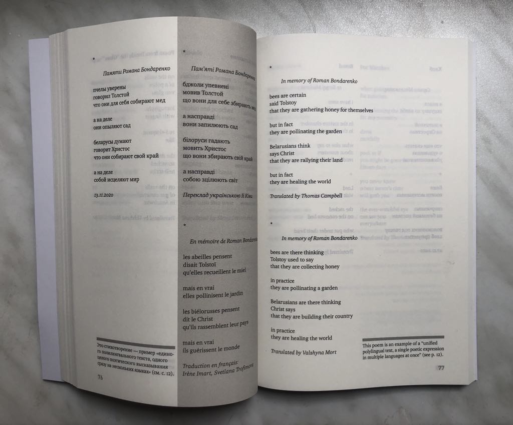 — Я б сказаў, што гэта новая мастацкая рэальнасць. Арыгінальны тэкст і пераклад з’яўляюцца амаль адначасова. Паэт і перакладчык разам прамаўляюць з адной падзеі, у глыбокім інтэлектуальным і эмацыйным рэзанансе. Тут можна сцвярджаць, што пераклад або пераклады становяцца паўнавартаснай часткай агульнага мастацкага выказвання. Можна прыводзіць музычныя сімфанічныя або харавыя аналогіі. У кнізе «Вайна і мір» ёсць разварот, дзе прадстаўлены верш «пчолы ўпэўненыя…» памяці Рамана Бандарэнкі. Побач з арыгіналам размешчаны пераклады на ўкраінскую, французскую і два ангельскія пераклады. Такія калектыўныя творчыя акты даюць каштоўнаснае перажыванне нашай агульнай сусветнай звязанасці.