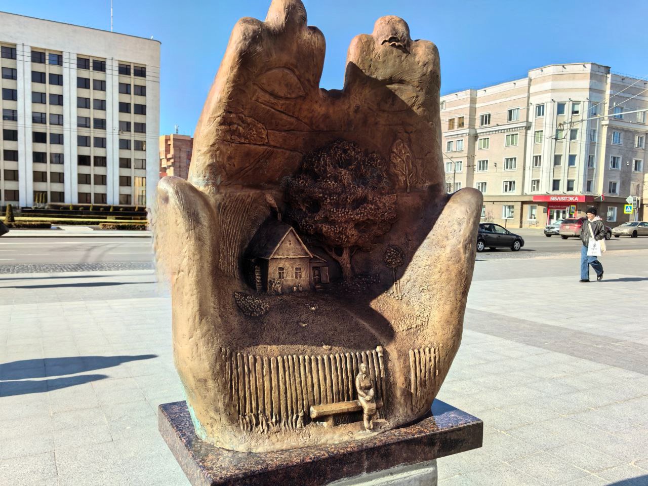У Магілёве на плошчы Адзінства паставілі скульптуру «Спадчына». Гэта цудоўна выкананы твор, з мілай ледзь не кожнаму беларусу тэмай: вёска – як частка спадчыны. «Самыя цёплыя ўспаміны ў чалавека заўжды з дзяцінства. І гэта ўспаміны пра хатку, якой ужо, можа, і няма. А далоні і вочы — гэта рукі Бога, які глядзіць і беражэ нашу Беларусь», — тлумачыць задуму аўтар Андрэй Вараб’ёў.